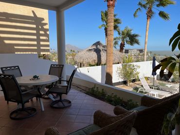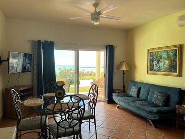 Our Sun Suite has a lovely view from the living area. The bedroom has a king size bed and is at the back of the suite for those that do not wish to wake up with the sun. The living area has a futon so this suite can sleep two adults and two children. Full kitchen with table and chairs for dining. The Sun Suite has a great terrace with a table and chairs for dining and chairs for reading or enjoying the view.